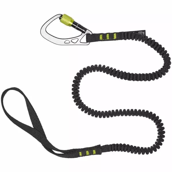 Sa sangle élastique offre une portée maximale et une meilleure résistance à l’eau que le nylon, tandis que le mini-mousqueton en acier permet de fixer le système à la tête ou à la pique du piolet.