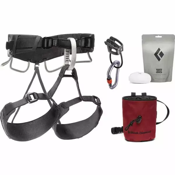 Offrant des possibilités de réglage et d’ajustement maximales grâce au MOMENTUME 4S HARNESS PACKAGE de Black Diamond, un ensemble de matériels d’escalade composé d’un harnais, d’un sac à magnésie, d’une recharge de magnésie, d’un assureur classique et d’un mousqueton.