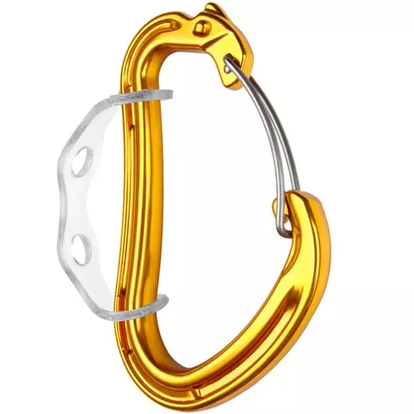 Ce mousqueton de grimpe se fixe sur le baudrier avec un anneau caoutchouc et se positionne de façon optimal pour recevoir ou prendre le matériel nécessaire pendant la progression.