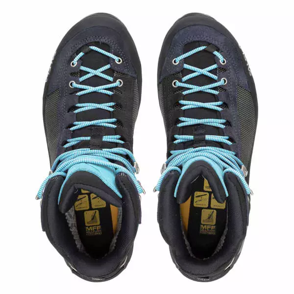 Sa tige intègre un système de laçage 3F qui permet un ajustement précis et une excellente tenue du talon. La zone haute à l’arrière de la chaussure est souple pour ne pas forcer sur le talon d’Achille, lors des descentes par exemple. Au niveau de la semelle, la partie intérieure est en nylon et fibre de verre pour assurer un soutien solide et une bonne rigidité, tandis que la parti extérieure procure une adhérence optimale grâce à sa composition en Vibram® Mulaz, d’autant plus qu’elle inclus une zone avant grippée « climbing zone » pour escalader les rochers.