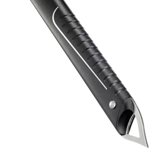 – Haute résistance et aspects pratiques : panne très résistante en acier offrant une surface d’appui confortable et avec un design des arêtes permettant de tailler des marches efficacement, panne inclinée pour guider correctement le piolet dans la neige (utilisation en piolet-canne), tête et pointe équipées de trous pour le passage d’un mousqueton ou d’une sangle, manche en aluminium de haute qualité (aluminium 7075 utilisé en aéronautique), avec finition anodisée pour une excellente protection, manche usiné dans la masse pour créer un grip procurant une meilleure tenue en main.